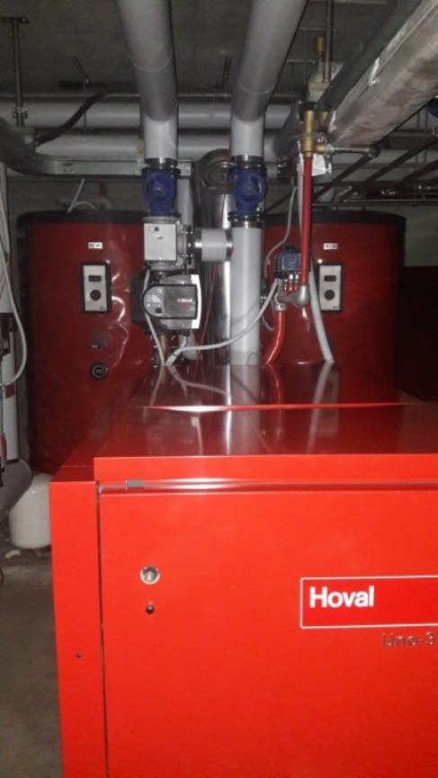 Es wurde ein neuer Biomasseheizkessel zur Verbrennung von Pellets (KWB Pelletfire MF2 GS 135 kW) installiert. Als Backup Anlage wurde ein Heizölkessel Hoval UNO 3 (Nennleistung 190 kW) installiert.Beide Anlagen sind mit einer Folgeschaltung an den Pufferspeicher angesteuert.