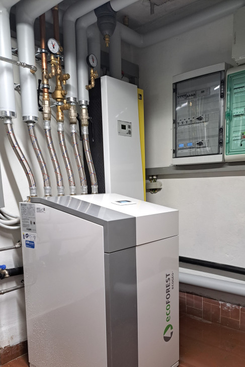 Installazione di una pompa di calore a terra per riscaldamento + raffrescamento dell'edificio, completo di allacciamento idraulici ed elettrici, accumulatore, stazione di acqua sanitaria instantanea, pompe di efficienza energetica, valvole 3-vie con servomotori, contatori di calore, gruppo pompe impianto solare, impianto di ventilazione e termosifoni.